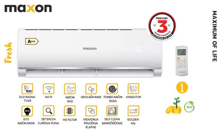 Maxon klima uređaj koristeći djelotvoran način filtriranja i ioniziranja učinkovito će osvježiti prostor. Unutarnja jedinica ima antibakterijski filter što čini zrak koji udišete vrlo čistim. Uređaj visoke energetske učinkovitosti pri radu koristi ekološki prihvatljivo rashladno sredstvo R32.